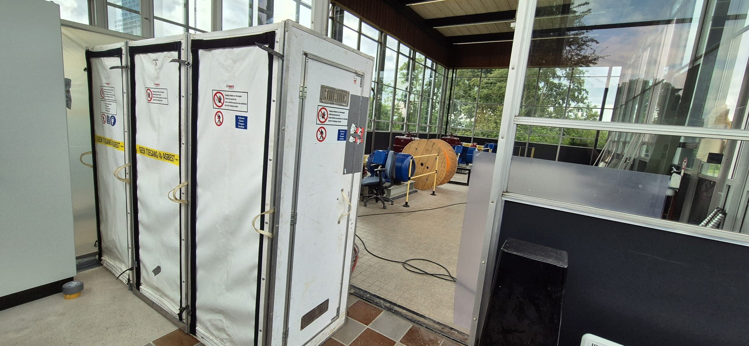 In Drongelen (Noord-Brabant) hebben we een asbesthoudende bitumen lijmlaag gesaneerd in een gemaal gebouw. De aanemer was bezig met de renovatie van het pand, toen ze de elektriciteitskasten weghaalden kwamen ze de bitumen lijmlaag tegen. Dit hebben wij met enige haast moeten verwijderen. Eerst hebben we een inventarisatierapport laten opmaken, daarna hebben we een sloopmelding aangevraagd. Vervolgens konden we beginnen met de asbestsanering, dit alles hebben wij in een week tijd kunnen regelen. Voor de verwijdering van de asbesthoudende bitumen lijmlaag hebben wij een containment opgebouwd. Omdat dit een bestaande situatie is moesten we alles klemmen om geen schade te maken, ook dit zijn wij gewend. Nadat we alles hadden verwijderd en schoongemaakt, kwam er een extern laboratorium kijken of het netjes is verwijderd. Alles was netjes verwijderd en schoongemaakt. Wij hebben alles weer voorzichtig gedemonteerd en opgeruimd. Heeft u ook ergens asbest zitten. En wilt u dit laten verwijderen? Belt of mailt u ons dan gerust wij pakken elke opdracht aan.